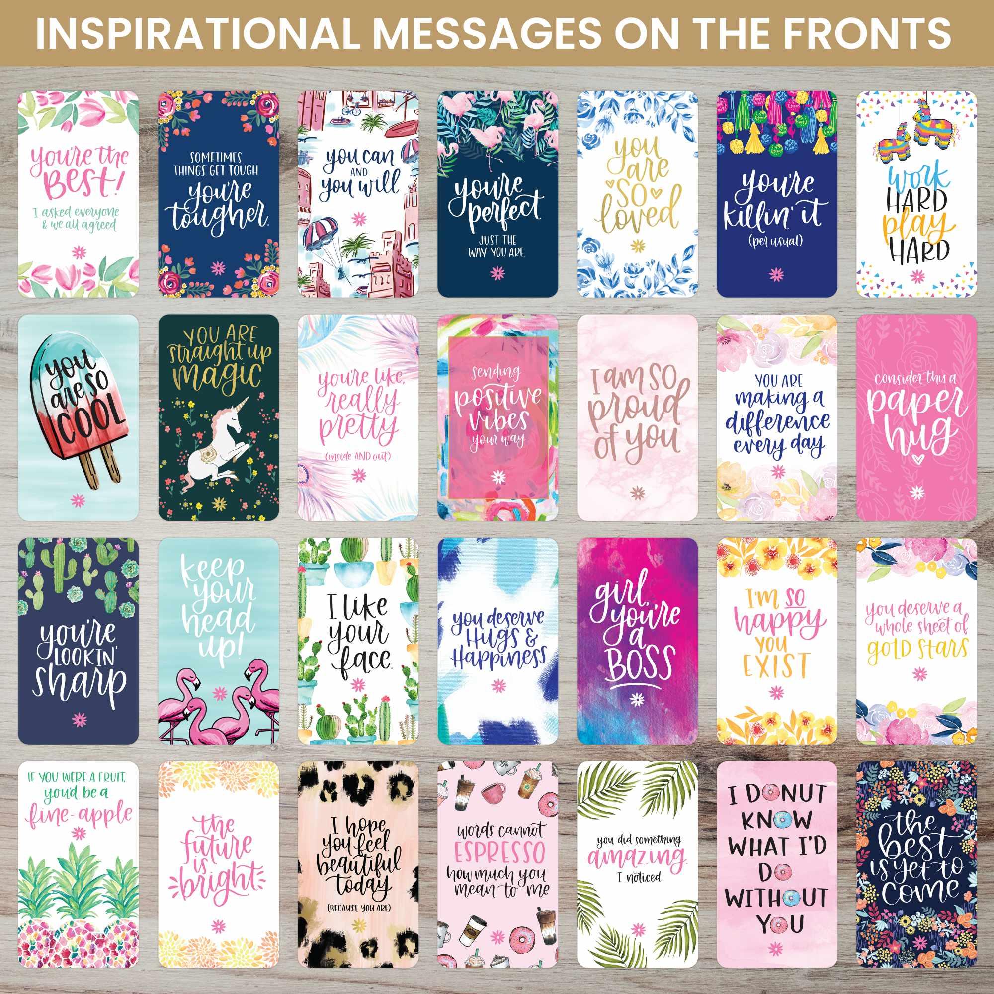 • Front of cards are glossy and feature an inspirational quote or positive message