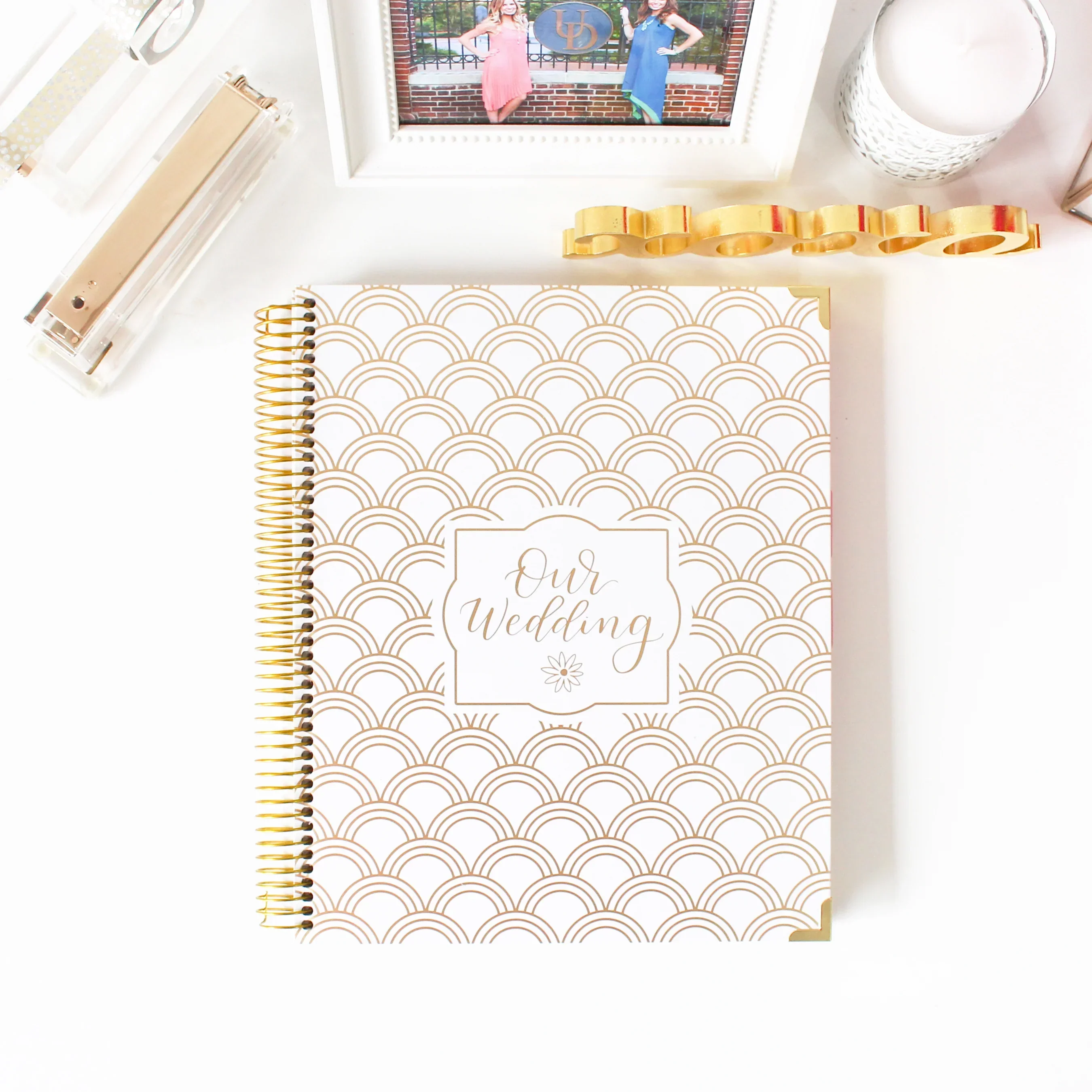 - 9” x 11” hard cover Wedding Planner with gold foil, gold reinforced metal corners, and gold single coil metal binding, allowing your planner to lay flat on your desk
